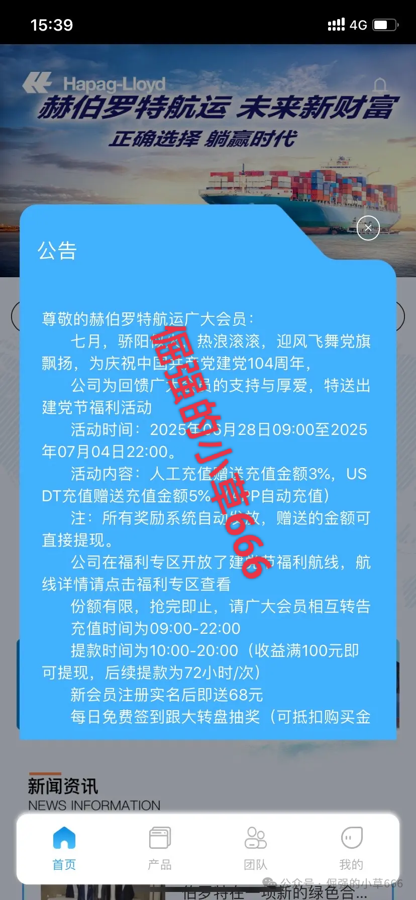 从“赫伯罗特”(Hapag Lloyd)玩法来看,它集齐了资金盘和传销的常见套路。首先是用高额诱饵吸引投资者上钩,注册就送68元,充值还送钱,人工充值送3%,USDT充值送5% ,签到抽奖也送“现金”,买产品还号称送价值198元的礼品,可这礼品实际成本究竟多少,可想而知。再者,设置门槛费和长周期锁仓。最低投资3000元,最高5万元,返利周期动不动就几个月甚至一年以上 ,有日复利、到期返本息等形式,把投资者的本金牢牢套住,为以后的收割做准备,项目方要卷款跑路1秒钟就够了。