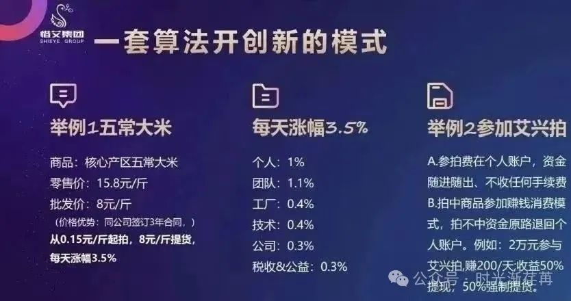 惜艾集团还宣称项目靠着线上商城和线下实体超市,用全年无休(365 天不间断交易)的拍卖模式来赚钱。用户今天买入产品,明天卖出,理论上能拿到 3.5% 的利润,而且这利润还能持续上涨。