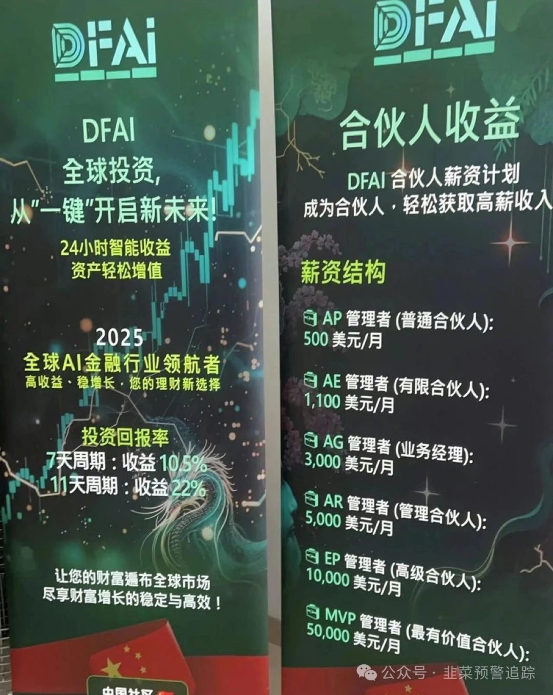 DFAI资金盘约8000人参与,吸纳资金1.2亿,正处爆发到衰退过渡期。它冒用美国公司名义,人员团队虚构,办公地址不实。以AI交易获稳定收益为噱头,采用静态+ 动态模式拉人。其域名、网站、APP等基础设施简陋违规,宣传充斥虚假信息。预计10月崩盘,为避免损失,投资者应尽早撤离,远离此类资金盘。