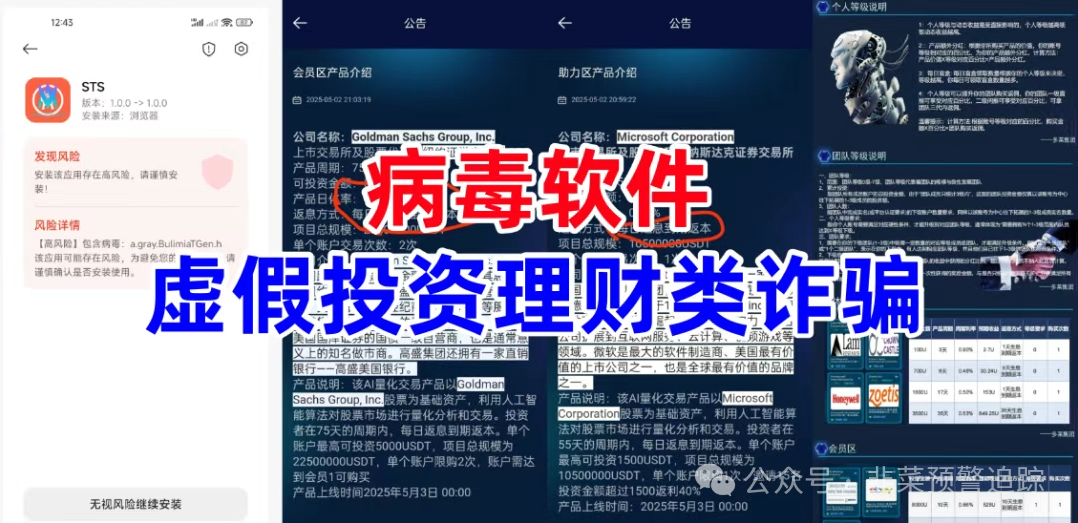 AI STS打着AI智能旗号,宣称打造基于智能合约的未来金融平台,实现财富与社会责任共赢,实则是资金骗局。以商学院培育+AI智能交易包装,设四级班级收学费入门费,按邀人层级和班级给黄金奖励,形成传销结构。还推出投资产品,承诺固定日息、到期返本,按投资和团队规模划分等级给予额外奖励,是典型传销与非法集资结合的资金盘。7月6日,其APP信息清空,疑似跑路,大家务必远离此类诈骗。