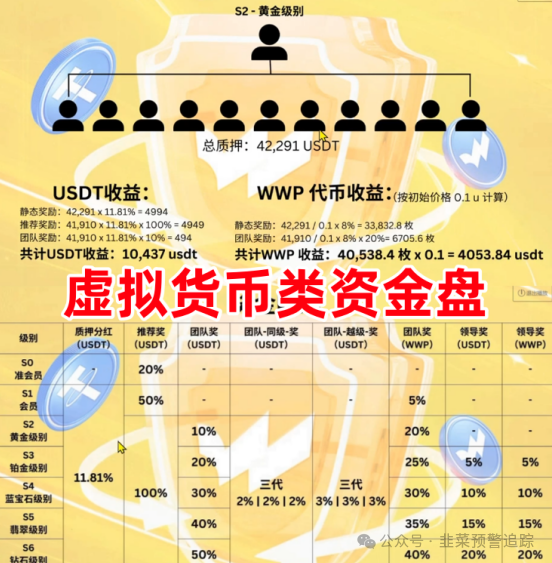WWP 虚拟币是典型的虚拟货币类资金盘。它以区块链和虚拟货币质押为幌子,让参与者质押381-10000获取会员资格。承诺每月11.81%的静态收益,还给予等价投资额的虚拟币。此外,发展下线有直推奖、三代同级奖等团队收益。此类项目多为诈骗,虚拟币价值无保障,拉人头模式涉嫌传销,投资务必远离,谨防财产损失。