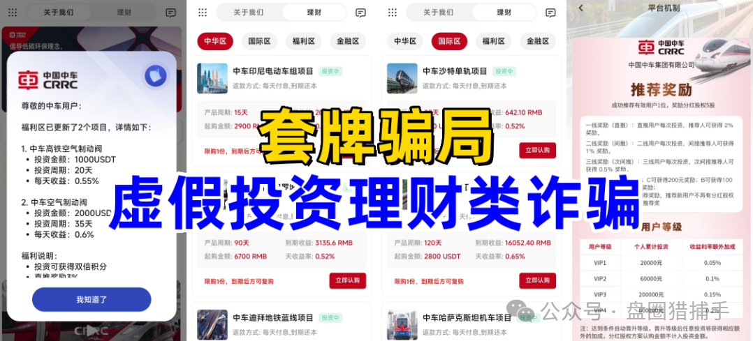 假冒“中国中车”APP宣称投资动车项目,2900元或600USDT起,15-180天周期,日收益0.48%-0.8%,实为虚拟币“杀猪盘”。小额兑现诱信,大额卷款跑路。非法链接下载,未备案,传销拉人头,收款涉第三方及虚拟币,涉嫌诈骗、洗钱。中国中车澄清无此业务,官网打击冒用。立即止损、报警,勿信高收益!转发警示,远离陷阱!