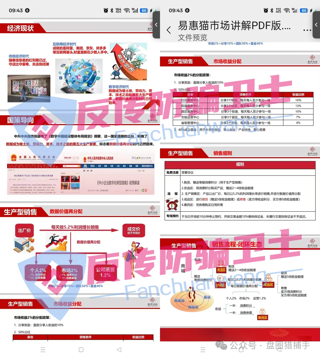 易惠猫借“数字中国”战略,虚构“数据价值再分配”概念,包装高大上企业形象,谎称全民共享数字红利。采用“竞拍抢购寄售”模式,宣称每日5.2%利润增长(年化收益率超1900%),收益分个人2%、市场2%、公司1.2%,市场收益再按分享10%、团队50%、基金40%分配。设一星至五星等级,升级需拉人头,收益含30%平均、70%加权分配,购货赠2-3倍收益额度,提货赠5倍额度。实为“入门费+拉人头+团队计酬”传销架构,通过复杂流程和高收益诱导投资,限制退出形成“投钱-拉人-再投钱”闭环。无新人加入,资金链必断裂,卷钱跑路风险极高。建议立即止损、保留证据报警,远离此类陷阱!