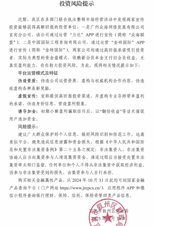 2025年6月30日,宜宾叙州区财政局点名“众海联盟”为高风险资金盘,揭露其伪造资质、虚构盈利三大特征。