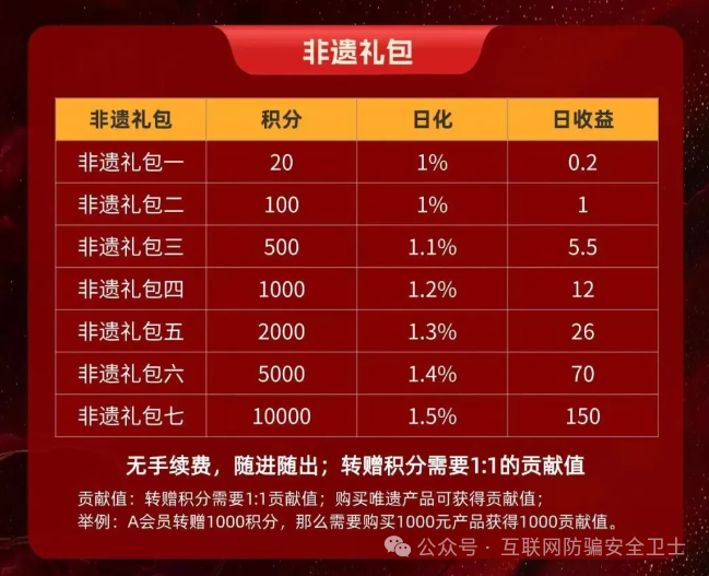 从表面上看,其 “非遗 + 电商 + 社交” 的创新模式似乎为文化传承与商业增值提供了新的途径。据了解,新人用户只需花费 58 元购买新人礼包,就能获得 20 积分,并且每日释放 1%,也就是日收益 0.2 积分。同时,平台还提供多种非遗礼包套餐,从 100 积分到 10000 积分不等,日化率从 1% 到 1.5%,日收益从 1 积分到 150 积分,并且宣称无手续费,随进随出。这种低门槛、高收益的宣传,对于许多渴望在互联网上轻松赚钱的人来说,无疑具有极大的吸引力。小编在想什么样的项目可以做到如此高的利润?此项目他的盈利点在哪里?是如何能支撑那么高的利息呢?是靠卖非遗产品?这个非遗产品又是谁来消费?小编能想到的只有是投资人。可如果一直是投资人来购买,这高额的利息将会是投资人沉重的代价。