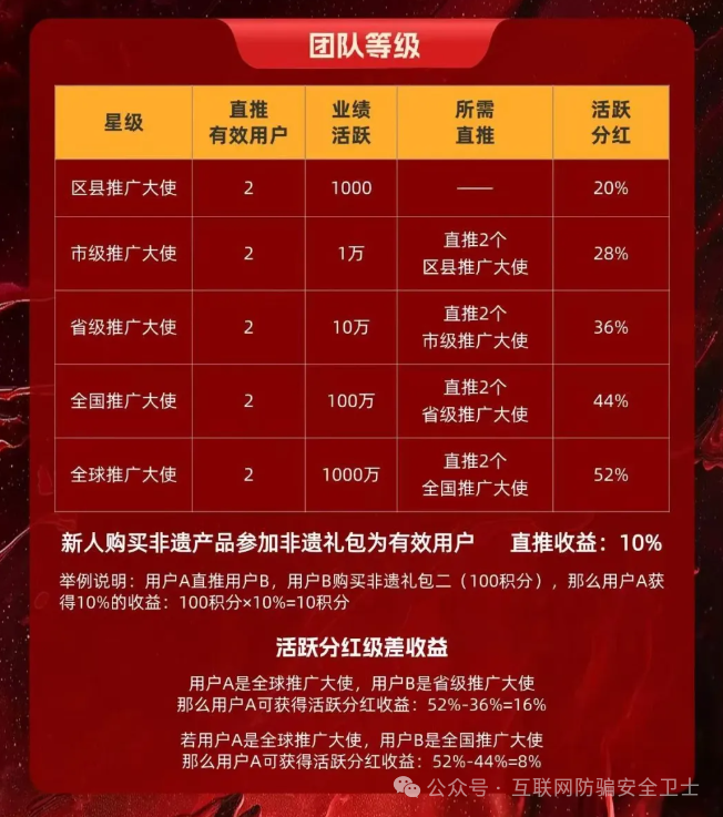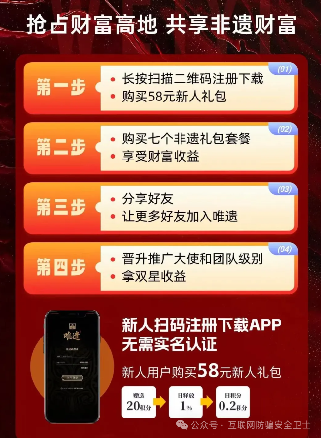 日,很多网友私信小编,咨询“唯遗商城”项目是否是新资金盘传销骗局?因小编对此项目没有具体的了解,故小编没有正面回答,今天小编就和大家一起分析下,这个号称背靠政府的项目究竟是不是能够经得起推敲。下面我们一起看下唯遗商城的宣传。打着 “非遗 + 电商 + 社交” 的旗号,以日化 1% 的收益承诺吸引了不少人的目光。然而,看似诱人的背后,实则隐藏着诸多值得警惕的风险。