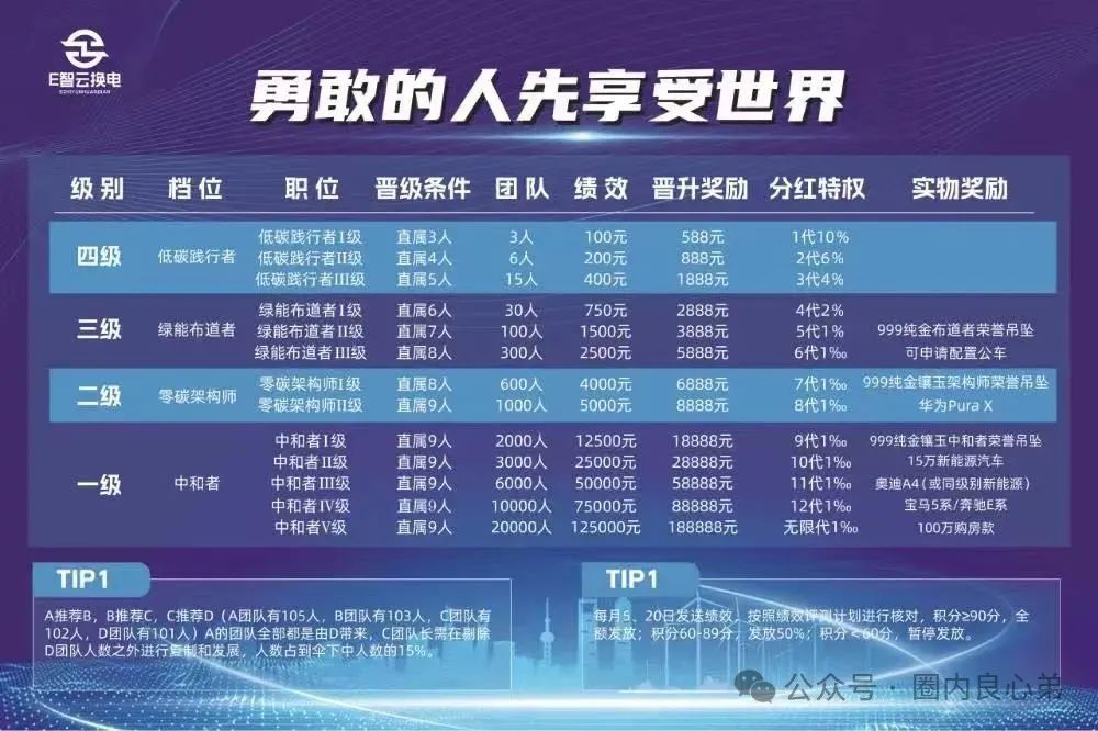 最近良心弟后台常有粉丝留言,咨询一个台字叫”E智云换电“平台,说说某博主还为该项目宣发,在良心弟看来打着新能源的外衣,做骑手换电的项目,用户只需要投资该平台可以实现躺赚神话,真的有这么好的事情吗?我想摸着良心说,并没有这么好的事,所谓的换电都是一场彻头彻尾的骗局罢了,还在参与其中或者投资该项目注意警惕吧,其手法与近期多地爆雷的中基绿能、涤旧能源,骗局如出一辙——以新能源之名行金融诈骗之实,目前已经在个城市开始肆意掠夺非法集资,接下来良心弟也就按照几个逻辑来讲解该项目的诈骗资金盘的本质。