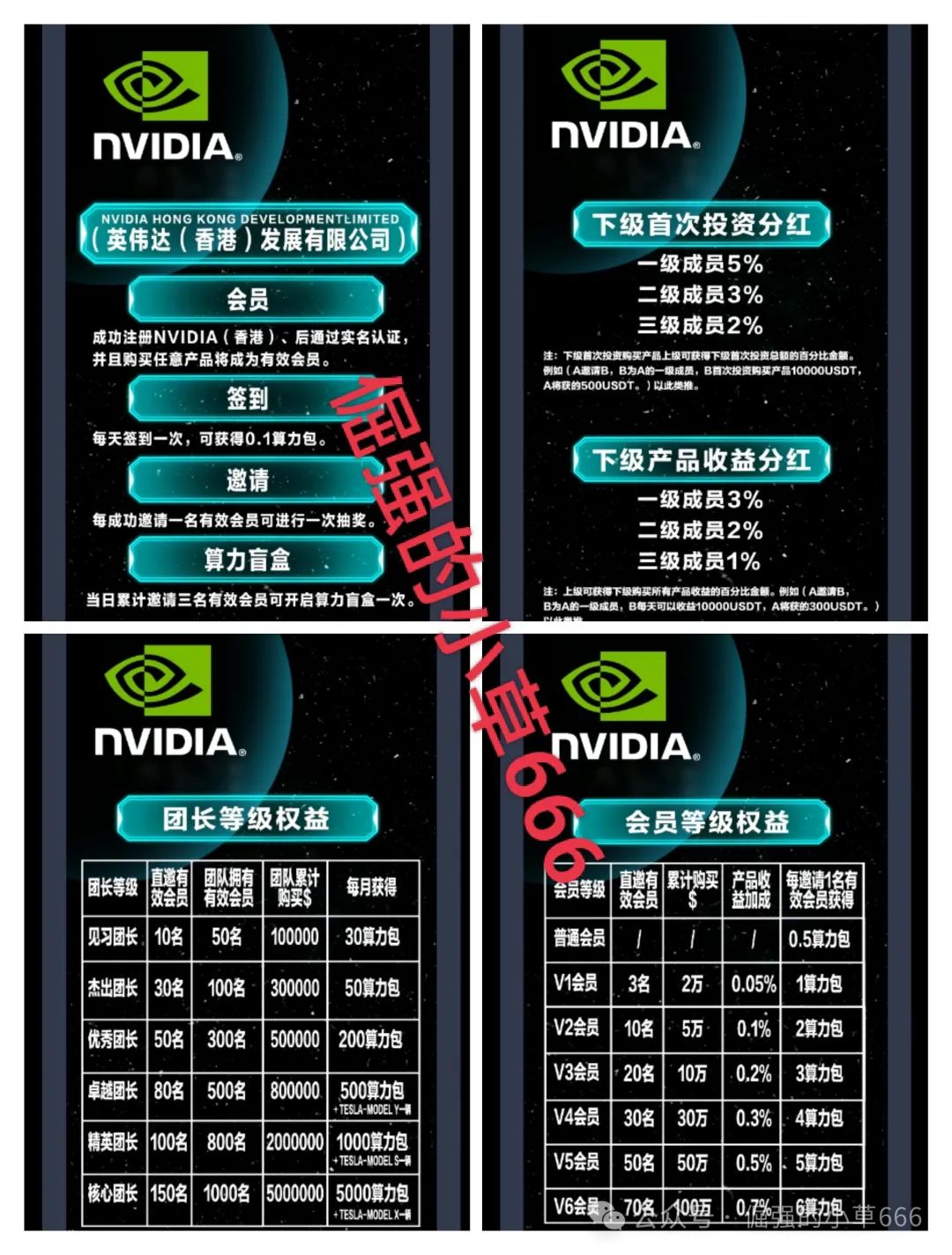 套牌的“NVIDIA”英伟达是去年11月份上线,主要以投资QUADRO RTS 8000芯片,RTX600 ADa芯片和算力包,产品周期几乎都是几百天和几十个月,偶尔会上些10多天产品吸引新人,并且按天返-周返-月返,锁仓机制是特别明显,先别说做了能不能拿到结果,本金能安全出来就烧高香了,项目方用漫长的周期来锁住老用户,用小额短期产品吸引新人加入,如果继续执着去做,最终的结果一定是沦为韭菜,套牌的“NVIDIA”英伟达也算是活的比较久,甚至很多人都没有听说过,早在上半年的时候就有一个套牌的英伟达“Openstar”,被海口市公安局立案侦查,牵扯众多人上当受骗。