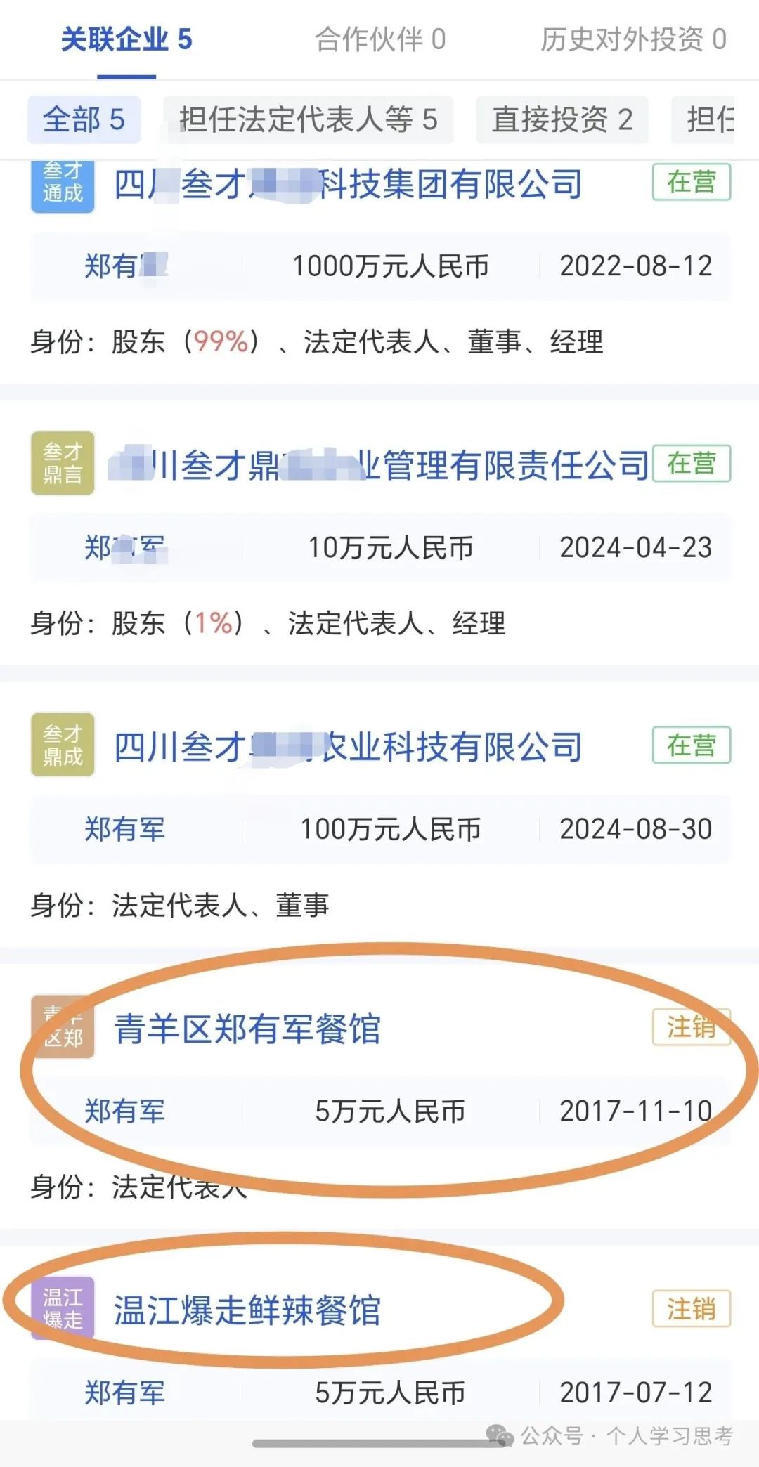 从现有的数据可查到,郑有军2017年在成都经营了两家餐馆(分别是温州爆走鲜辣餐馆、青羊区郑有军餐馆),后来全都倒闭。2022年后,郑完成华丽转身,转向所谓科技领域开始担任四川叁才通成科技集团有限公司法人。出任四川叁才通成法人后,公司短期内快速扩张关联企业。