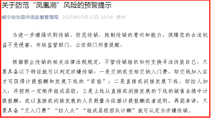最近一个月全国有8个地方多个部门发布了“凤凰潮”传销、资金盘的预警,不要再执迷不悟,远离传销、资金盘骗局。