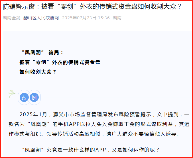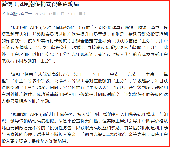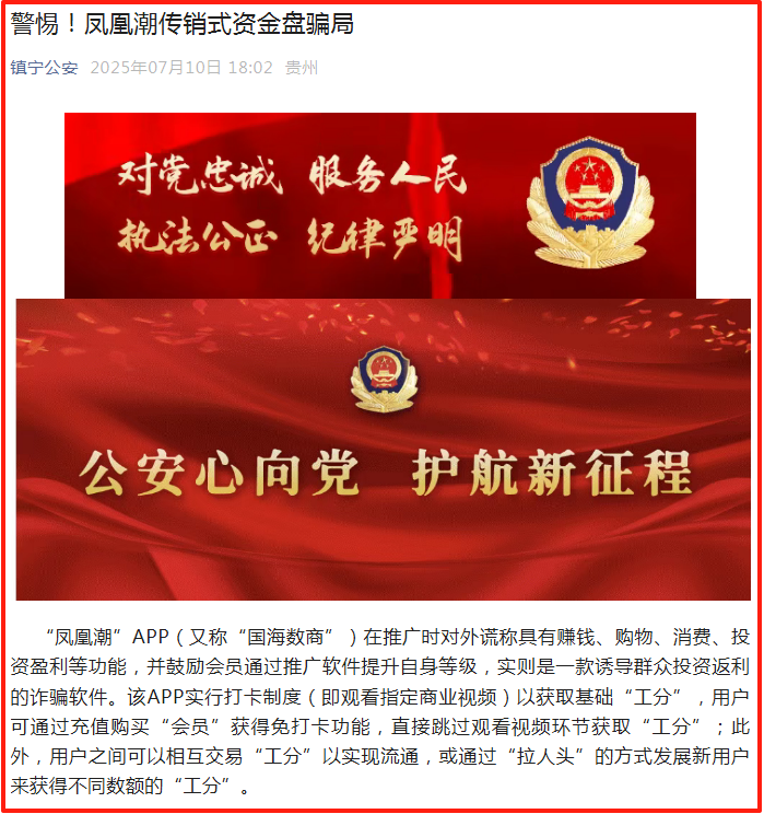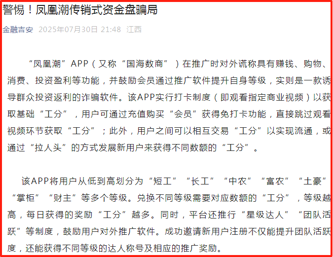 最近一个月全国有8个地方多个部门发布了“凤凰潮”传销、资金盘的预警,不要再执迷不悟,远离传销、资金盘骗局。“凤凰潮”APP(又称“国海数商”)在推广时对外谎称具有赚钱、购物、消费...