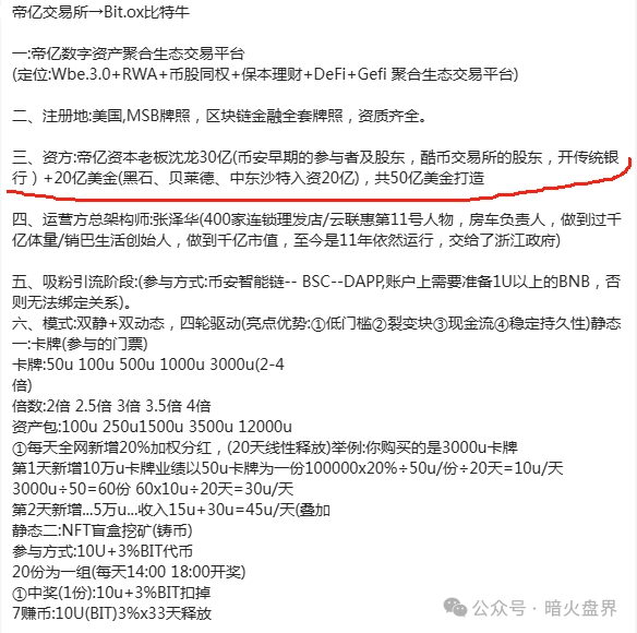 上面就是这个“帝亿交易所”的模式制度玩法介绍,各位自己看吧,暗火就不多讲解了,因为太乱了,看着就像大杂烩,卡牌、盲盒、拼团、挖矿什么的都有,给人的感觉是硬把几个资金盘模式容入一个项目里一样。在这里弱弱的问一句,是不是股东的意见不一致?每人都想整一套模式,最后没办法才全部塞到一个项目里的吧?估计那些上了50岁的都看不明白,大道至简这么简单的道理都不懂,玩法越简单越好。