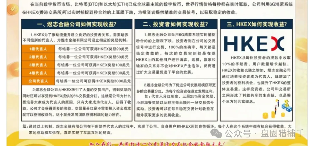 煜志金融为跟单类资金盘骗局,假称与香港交易所合作,实为无资质空壳公司。注册于2024年9月3日,注册资金1000万港币未实缴,。香港证监会未收录其信息,监管编号系盗用。平台通过伪造交易数据、操控涨跌,诱导充值,日化收益率1%起,150天高达843%,设六层分销抽佣18%,属传销模式。2025年6月28日冻结6000+账号,涉资超2000万,崩盘在即,立即撤资,保留证据报警!