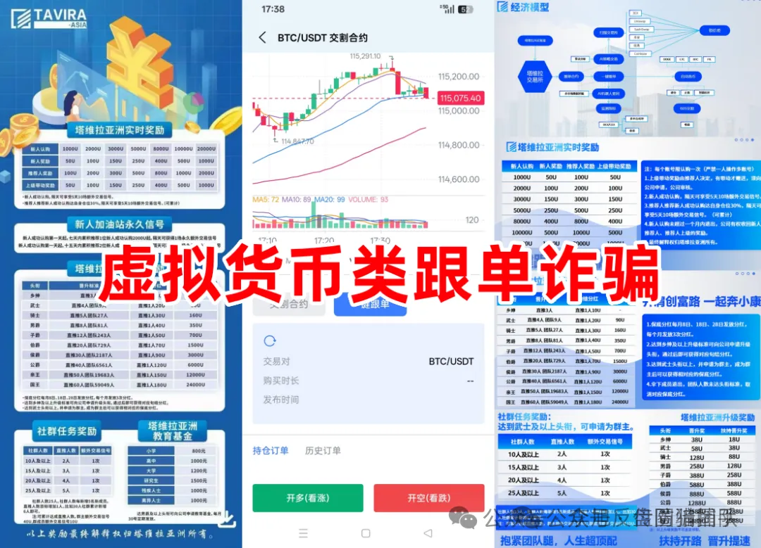 塔维拉亚洲交易所宣称“AI跟单99%稳赚”,实为短命资金盘骗局。假借AI量化交易,宣称与知名机构合作,官网域名仅注册半年,合作信息无迹可查,收益曲线疑似后台操控,交易结果与宣传不符。模式鼓励拉人头,设“武士”“伯爵”等10级头衔,靠新人资金维持,属传销本质。其操盘团队曾运作“星耀AK”“赛搏CBX”等短命盘,存活仅数周即跑路。现已出现提现延迟、客服搪塞、虚假收益图等崩盘前兆。投资者勿信高收益谎言,立即停止追加资金!