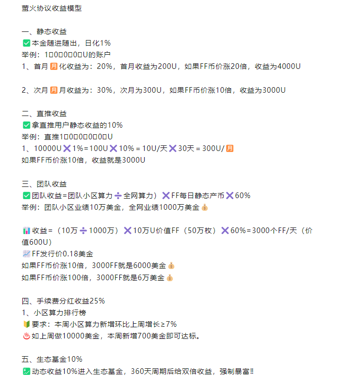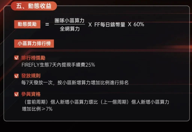 团队收益:按小区算力(团队投资额)瓜分全网FF日产量的60%;