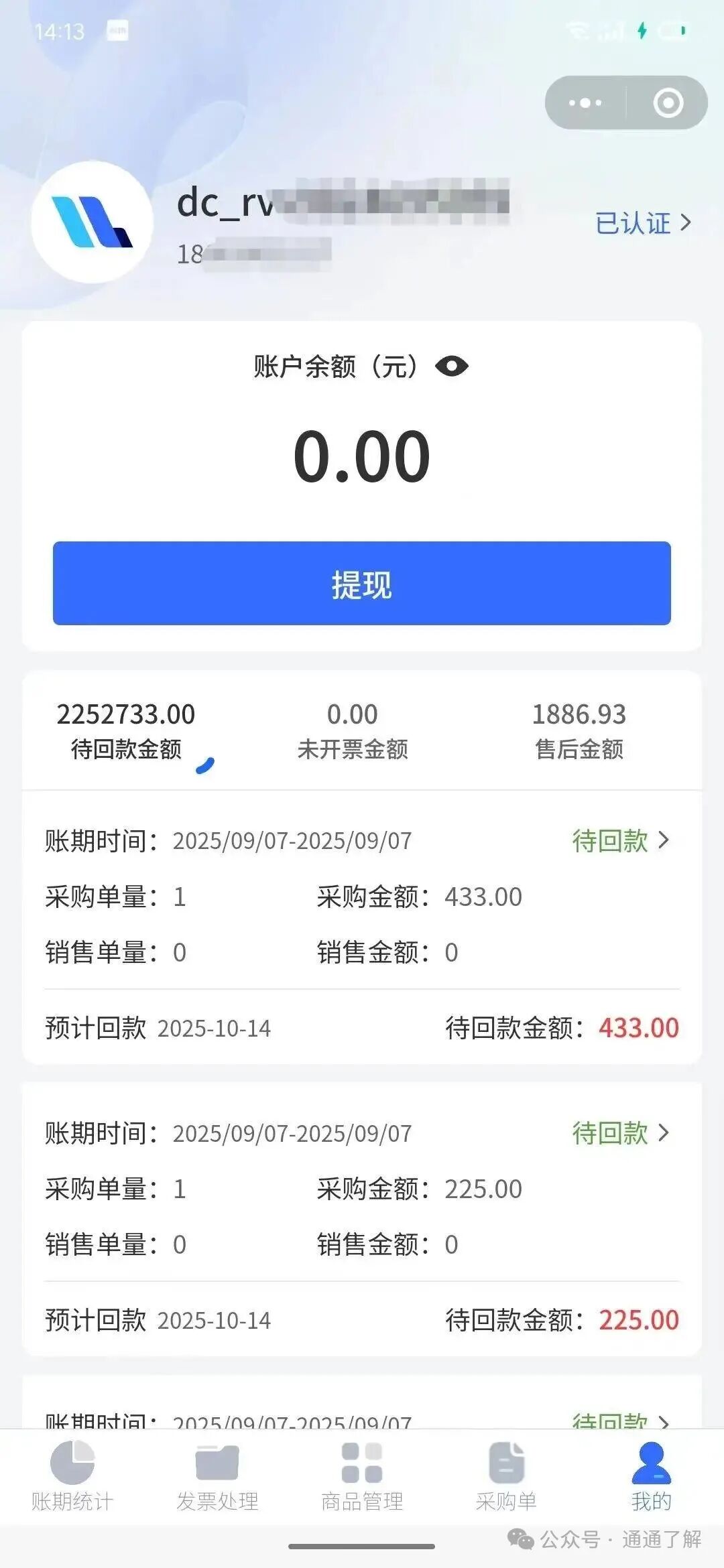 DC农业供应链供应商(商家)后台显示的待回款金额。