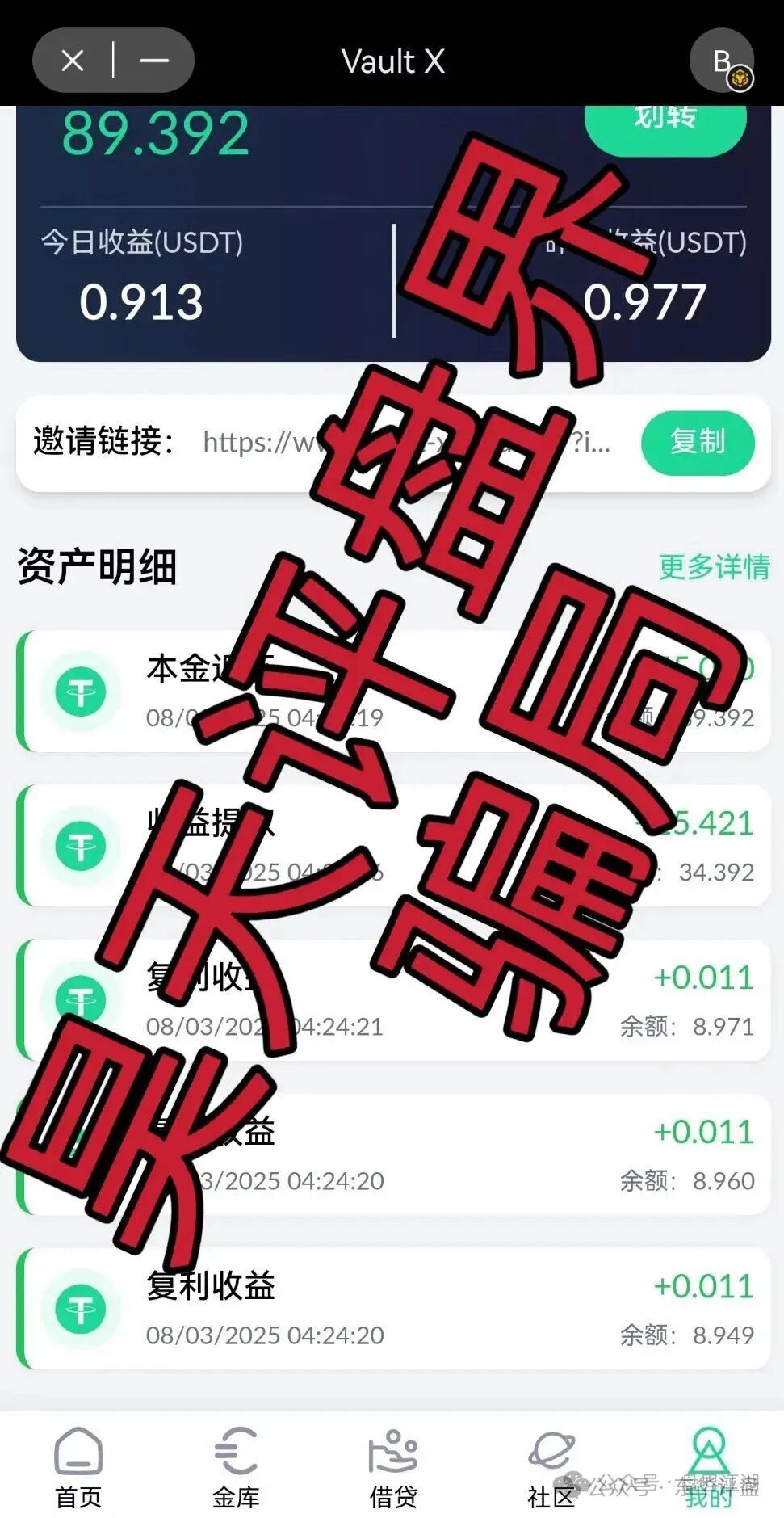 诈骗团伙还声称VAX(VaultX)项目并非传统资金盘,其合规框架、资金逻辑与治理结构均与资金盘存在本质差异,其实就是资金盘骗局,那么大的泡沫你告诉韭菜们说你是正规的?上个月的时候部分团队就已经撤离了,高度预警,即将崩盘跑路!即使恢复了昊天建议各位还是赶紧提现落袋为安吧,别想着自己不会是最后一颗韭菜,你永远跑不过操盘手...