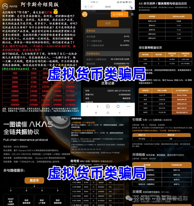 阿卡斯 AKAS全链协议,实则是暗藏危机的陷阱。该项目打着“链上银行”旗号,承诺质押可获日收益率0.441%的静态收益,还设置引领奖等动态收益吸引发展下线,俨然传销模式。参与者需下载境外虚拟货币平台进行交易,而虚拟货币交易在中国不受法律保护,这种模式涉嫌传销、诈骗、洗钱等违法犯罪行为。