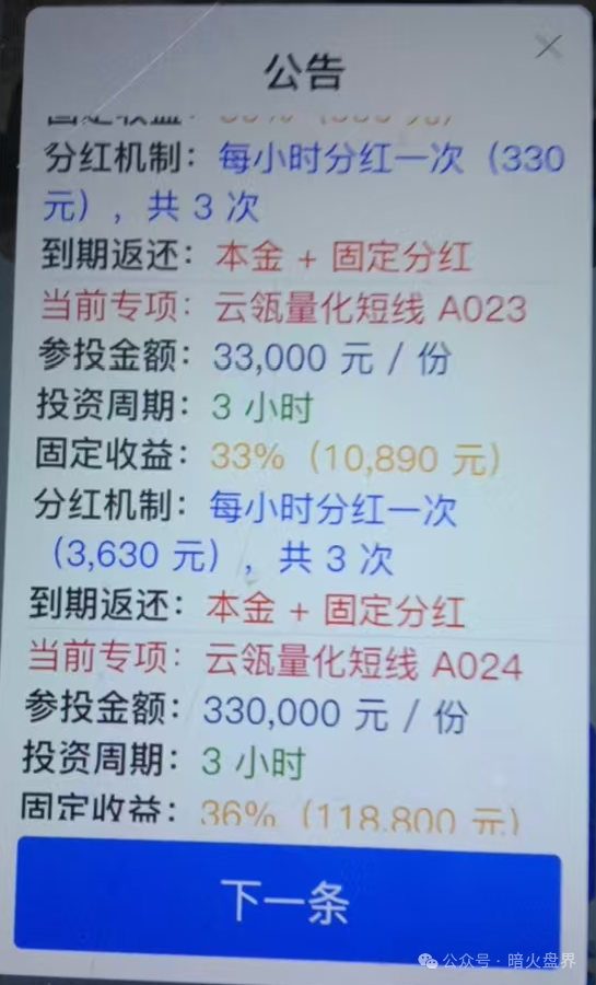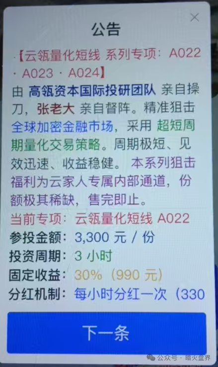 这就不用暗火多说了吧,你就是怎么看,都是杀猪盘,投资3300,周期3小时30%利润,每个小时赚330块,一天赚几千块,还上个毛班,打个毛工呢,所有人都可以躺平财富自由了。这么明显的杀猪盘都有人相信,不被骗都天理不容!