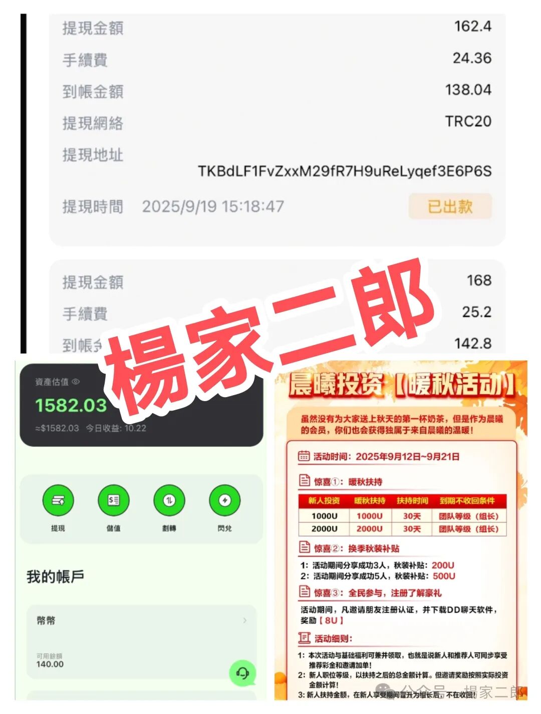 为了刺激老会员拉新,从八月上线以来,诱人活动一个接一个接踵而来,根本停不下来。目前搞的三天活动(9.23日-9.25日),充500u送500u,而且赠送的500u长期有效。也就是新人投资500u,每天可赚11u,日化收益率合到2%-2.2%,活动力度一次比一次大,一次比一次诱人,另外再赠送新会员额外20u奖励。这比做三五个月崩盘跑路的“泰足宝”收益还离谱,所以该平台到底能存活多久?我想大家心里应该有点数了。