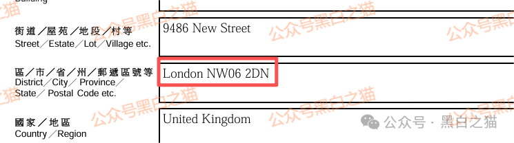 英国是邮政编码起源国,每一个建筑都有邮政编码,比地址更重要,书写格式是先地名后街道。而在伦敦根本没有NW06的邮政编码区。